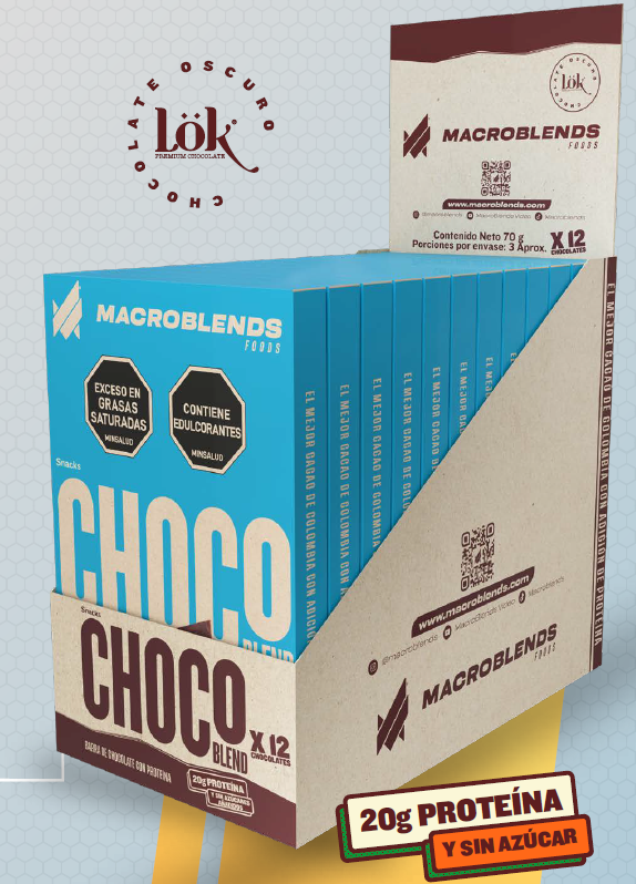 CHOCOBLEND es la más exquisita tableta de chocolate con 20 gramos de proteína y sin azúcar añadido. Deléitate con el mejor cacao de Colombia, enriquecido con proteína y un sabor inigualable.
